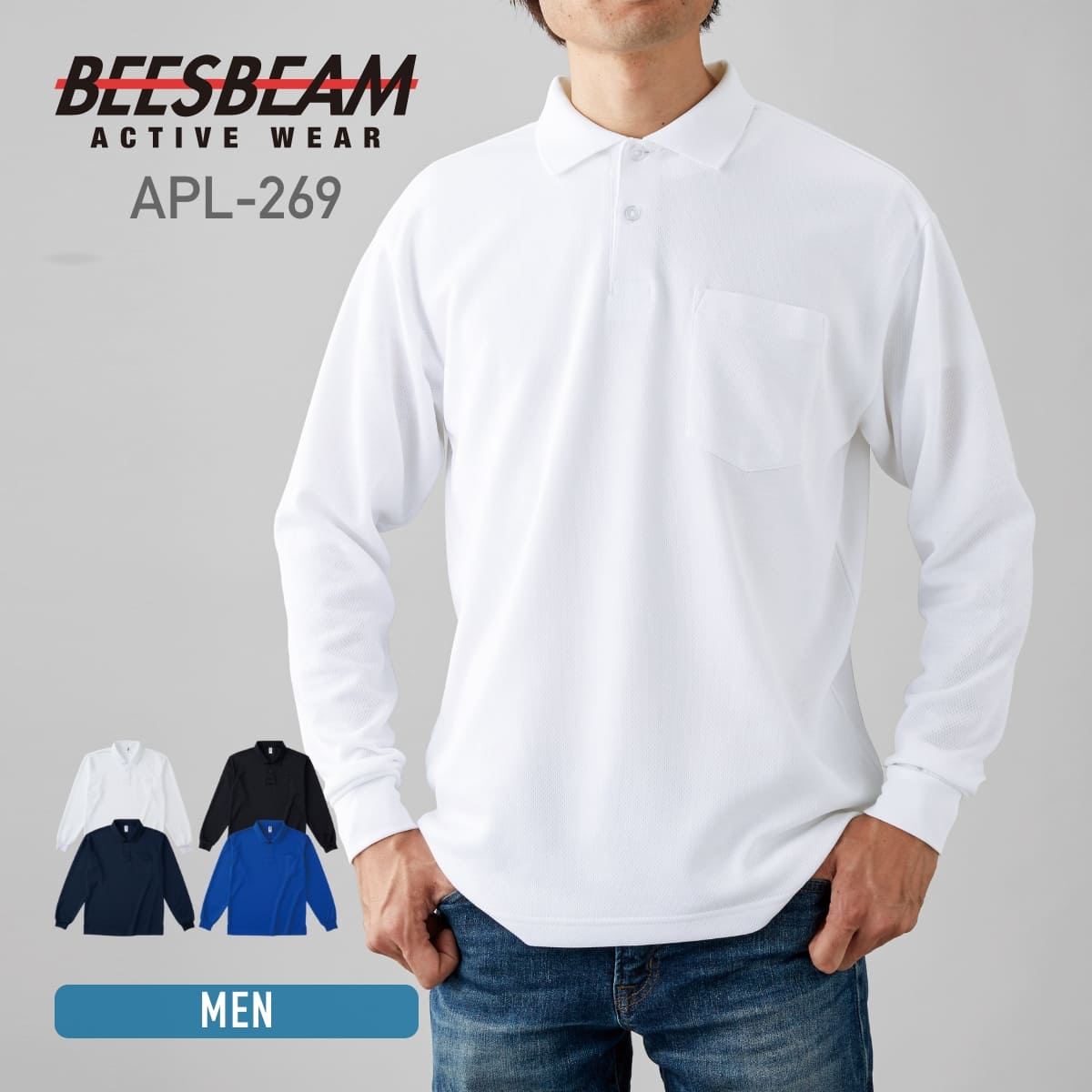 ポロシャツ 長袖 BEESBEAM ビーズビーム 4.3オンス ポケット付き 長袖アクティブ ポロシャツ apl-269 父の日 通学 通勤 ビズポロ ユニフォーム 白 黒 紺 など