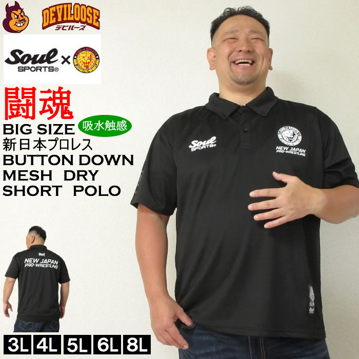 大きいサイズ メンズ SOUL SPORTS 新日本プロレス ドライ メッシュ ボタンダウン 半袖 ポロシャツ 黒 ブラック(メーカー取寄)吸汗速乾 プロレス 3L 4L 5L 6L 8L キングサイズ ビッグサイズ 大きい サイズ ブランド 服 おしゃれ カジュアル デビルーズ