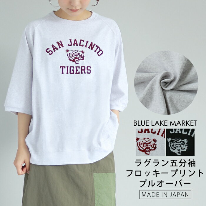【日本製】厚みのある天竺のラグラン 五分袖プルオーバー 長めの半袖 アメカジプリント ロゴ フロッキープリント オートミール杢 ブラック プリント 大人カジュアル ナチュラル BLUE LAKE MARKET ブルーレイクマーケット 春夏 夏服 秋 レディース 送料無料 B-481007