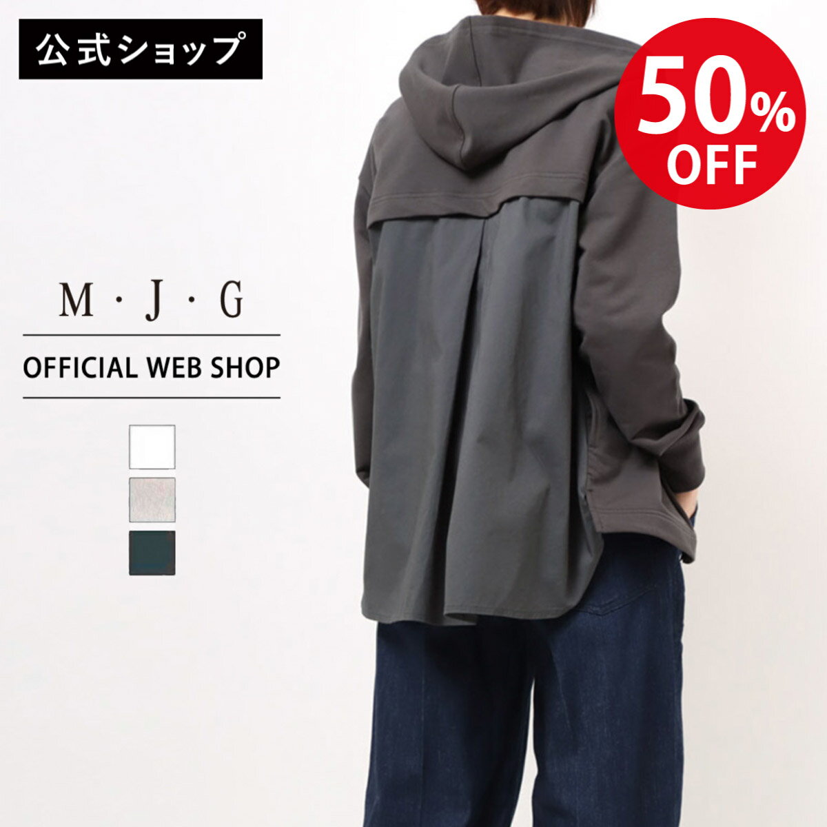【期間限定価格】【公式】【50%OFF】M・J・G エムジジェ コンビZIPパーカー レディース フード 背面切り替え 羽織 ジップ 布帛 オフホワイト グレー チャコール ストレッチ しなやか 裏毛[SALE]ミセス 婦人服 トップスブランド GMT341
