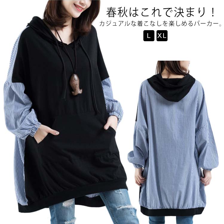 切り替え フード付き トップス 長袖 プルオーバー カジュアル パーカー トレーナー ゆったり オーバーサイズ 体型カバー 着痩せ お洒落 可愛い 通勤 大きいサイズ レディース