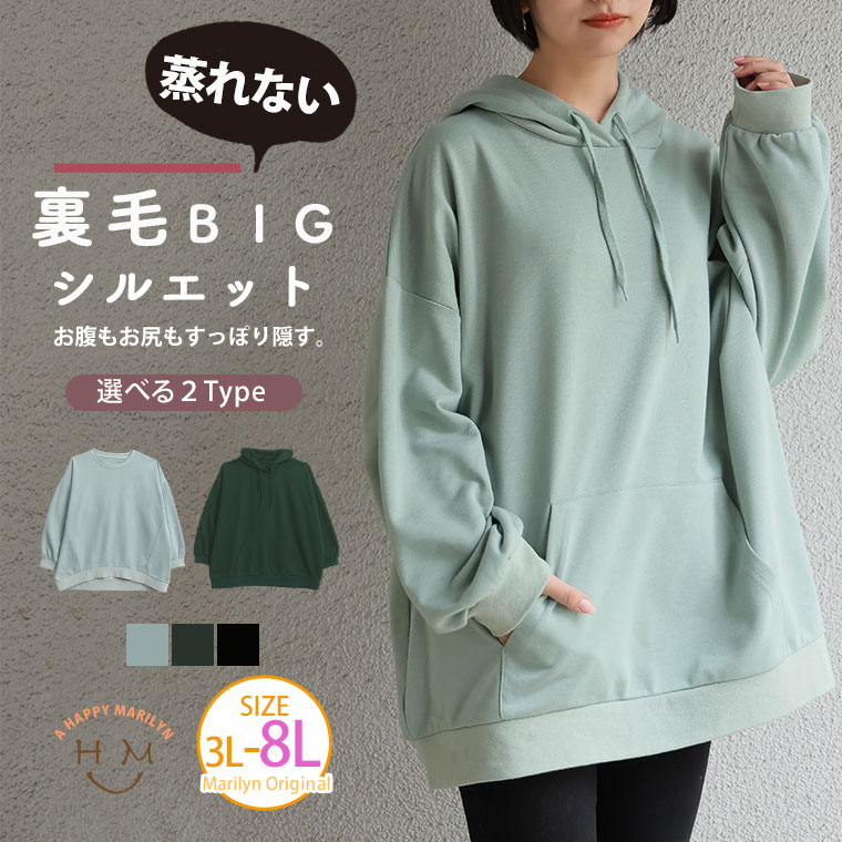 大きいサイズ レディース トップス | トレーナー・パーカーから選べる!お腹もお尻もすっぽり隠す BIGシルエット スウェット _ 3L 4L 5L 6L 7L 8L 長袖 春 春物 春服 ぽっちゃり ゆったり 裏毛 コクーン ビッグシルエット [473377/473378]