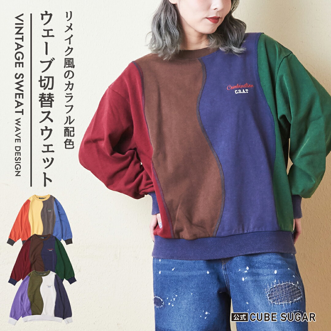 スウェット / 公式 CUBE SUGAR パウダー加工 スウェット ウェーブ 切替 プルオーバー(3色): アメカジ レディース トップス トレーナー クルーネック 長袖 ロゴ リブ カジュアル キューブシュガー