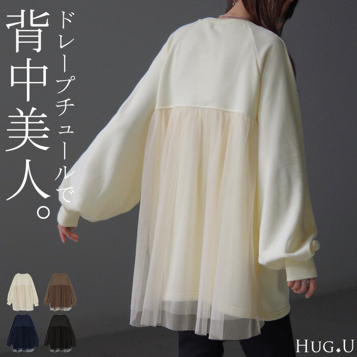 スウェット チュール ロンT レディース 【あす楽】 トップス シアー 透け お尻が隠れる 無地 ボリュームスリーブ センターライン ドルマン 長袖 Uネック チュニック ギャザー 体型カバー 大きいサイズ オーバーサイズ 長い ぽわん袖 異素材 白 黒 夏 秋 HUG.U