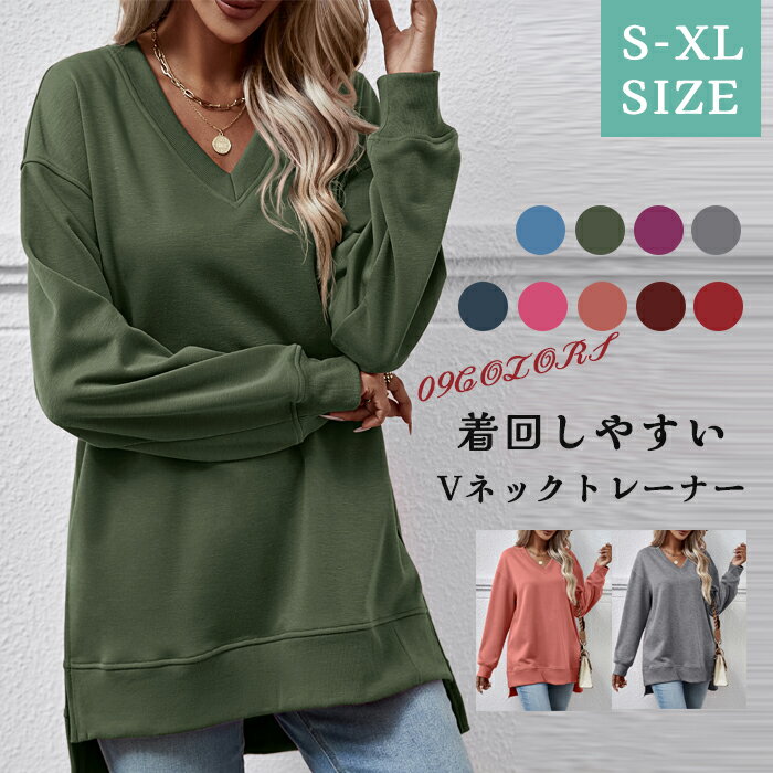 トレーナー レディース 秋 春 Vネック カットソー 長袖 無地 大きめ ゆったり トップス サイドスリット 重ね着 トレーナー レイヤード風 体型カバー シンプル カジュアル 大きいサイズ ゆるっと ビッグシルエット 幅広カフス 着瘦せ トレンド 着回し