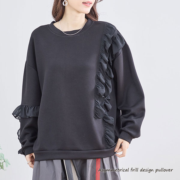 09日新作 TRUBE レディース トップス 長袖 ロングスリーブ クルーネック カットソー スウェット ゆったり アシンメトリー ラッフル きれいめ カジュアル 大人女子 ブラック Lサイズ 送料無料メール便なら
