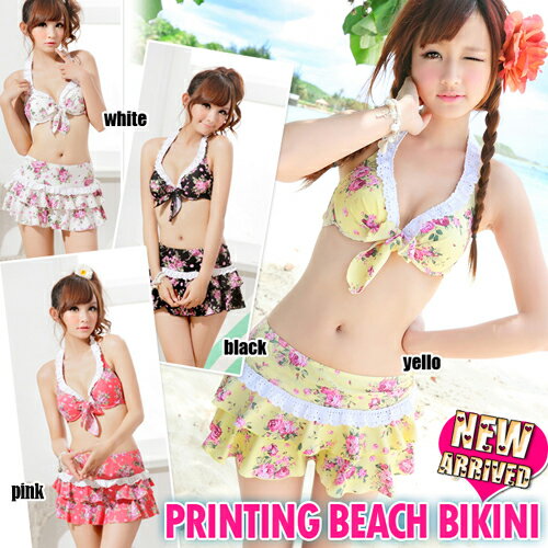 【スーパーSALE特別価格30%OFF&ポイント2倍】 3点セット水着 小花柄ワイヤービキニ 水着 ブラック 黒色 ピンク色 黄色 白色 レース感で女子力UP! レディース スカート ホルターネック リボン Sサイズ Mサイズ Lサイズ セパレート