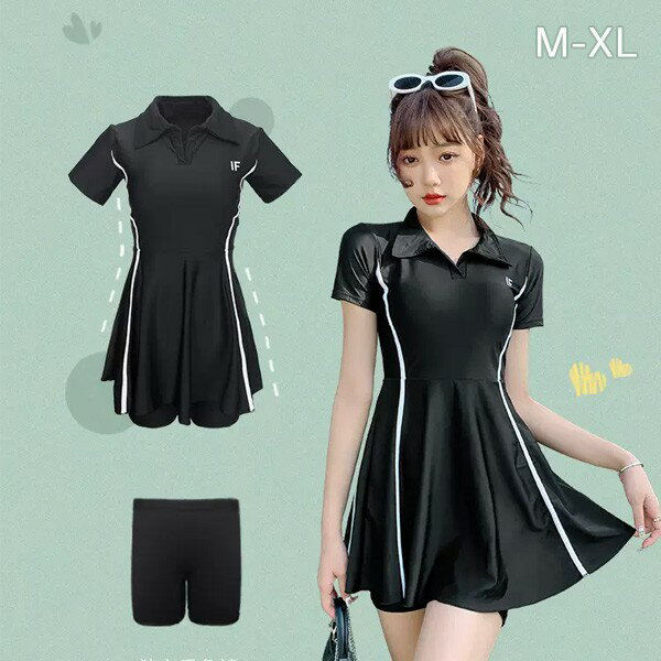 ワンピース水着 服みたいな 水着 2点セット 半袖 スポーツ風 ワイヤーなし パッド付 レディース 着瘦せ カジュアル シンプル セクシー 露出控えめ 写真映え 撮影用 海 夏 サマー プール リゾート かわいい 旅行 温泉 大人 女性用 ジュニア 学生 女の子 ブラック ホワイト