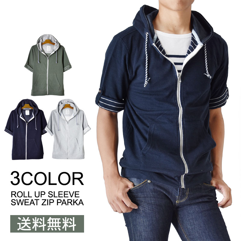 5分袖ロールアップスウェットジップパーカー メンズファッション トップス 服【ゆうパケット送料無料】【2-B10A】