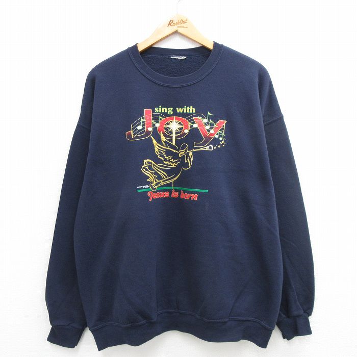 【中古】古着 長袖スウェット メンズ 00年代 00s 天使 音符 大きいサイズ 2L LL ビッグシルエット ゆったり ビッグサイズ オーバーサイズ クルーネック 丸首 紺 ネイビー XLサイズ 中古 スエット トレーナー トップス | 春夏 春物 春服 秋冬 秋物 秋服 メンズ 5OF