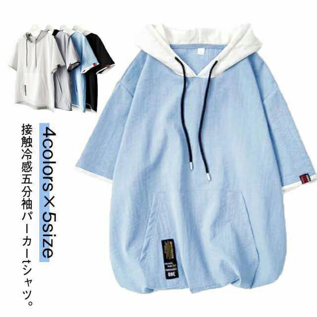 半袖 フード付きパーカー メンズ 夏用 パーカー 接触冷感 薄手 速乾 冷感 フード付き トップス 吸汗速乾 tシャツ プルオーバー 五分袖 カジュアル 涼しい 配色 切り替え 通学 ブラック ホワイト グレー ブルー 送料無料