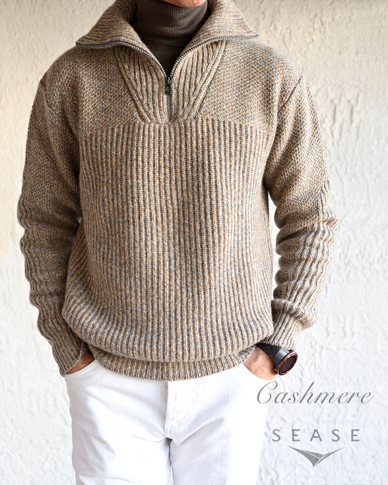 SEASE シーズ ・SCHOONER COARSEHAIR ハーフジップ カシミヤ ローゲージニット ・mod. KT033 ・col. STRAW ベージュブレンド ・made in Italy