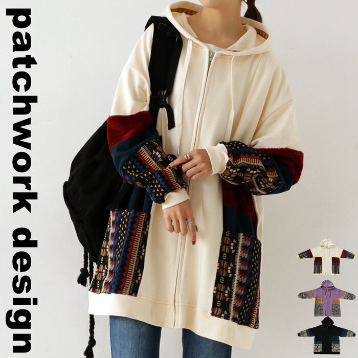 トップス アウター 異素材 パーカー パッチワーク コーデュロイ ネイティブ柄 前後差 ラウンドヘム スリット 秋冬 ボリューム ゆったり ナチュラル カジュアル レトロ ヴィンテージ 大人 レディース おしゃれ 誕生日 プレゼント AminaCollection