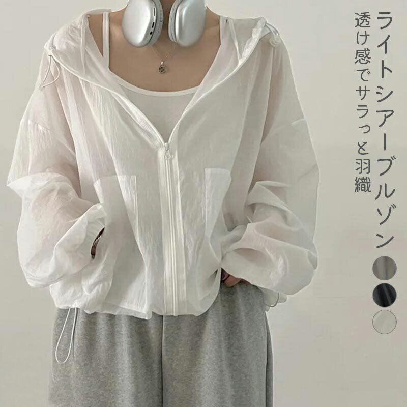 シアー パーカー レディース uvカット ブルゾン アウター 薄手 透け感 ゆったり シアーブルゾン 大きいサイズ ライトアウター 透ける フード付きパーカー バルーンスリーブ サマージャケット 冷房対策 紫外線対策 サマー 白 黒 春夏