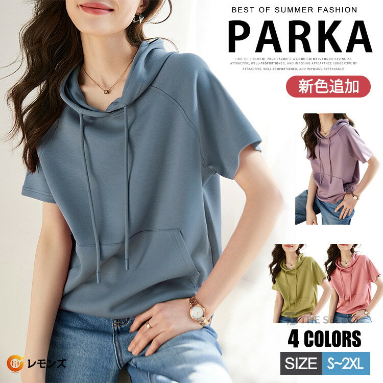 パーカー レディース 半袖 無地パーカー プルオーバー おしゃれ カットソー トップス 夏用パーカー 半袖パーカー 夏服 通勤 ルームウェア パーカ ゆったり フード付き 夏着 フェミニン 可愛い 大人 シンプル デイリー カジュアル ルーズフィット 新作