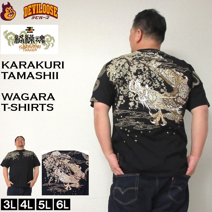 大きいサイズ メンズ 絡繰魂 龍神桜 刺繍 半袖 Tシャツ(メーカー取寄)3L 4L 5L 6L 和柄 コットン からくり 大きい サイズ キングサイズ ビッグサイズ デビルーズ インナー おしゃれ ブランド カットソー メンズファッション 春 夏 服