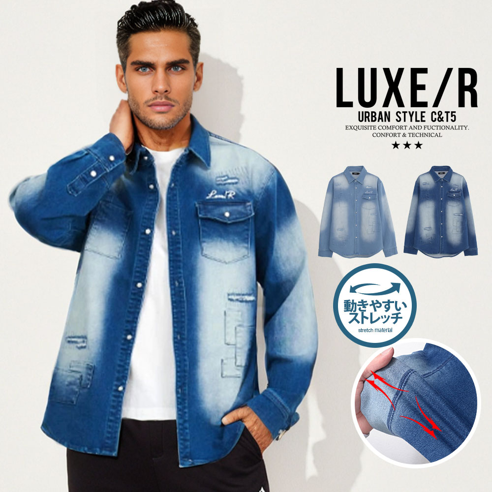 イケオジ おしゃれ シャツ デニムシャツ メンズ ブランド 長袖シャツ ちょい悪 オヤジ ミスタ—ジョージ ダンディ 40代 50代 60代 ファッション ブリーチ加工 ダメージ加工 リペア加工 古着 ヴィンテージ 大人 サックス ブルー カジュアルシャツ 中年男性 服 春