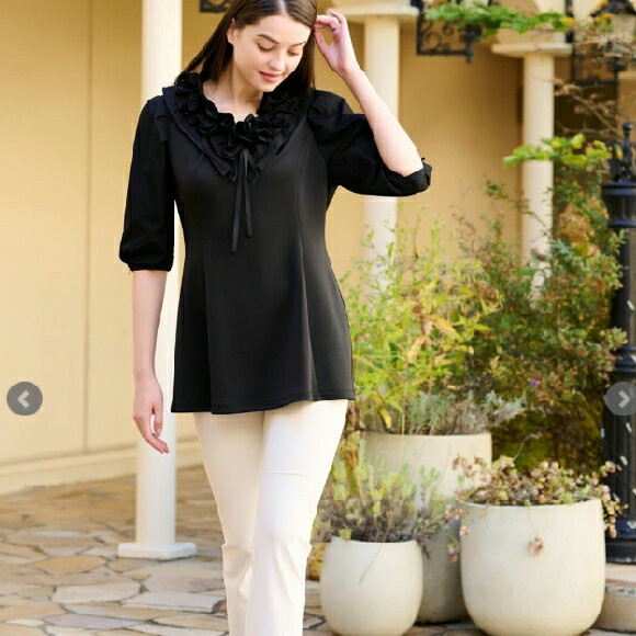 スーパービューティー チュニック フリル衿 二重袖 2412002 ブラック 2024年春夏 大人可愛い オーラボー ミセス レディース キレイメ アパレル 女性 M L LL 30代 40代 50代 60代 大人スタイル 若見え 洋服