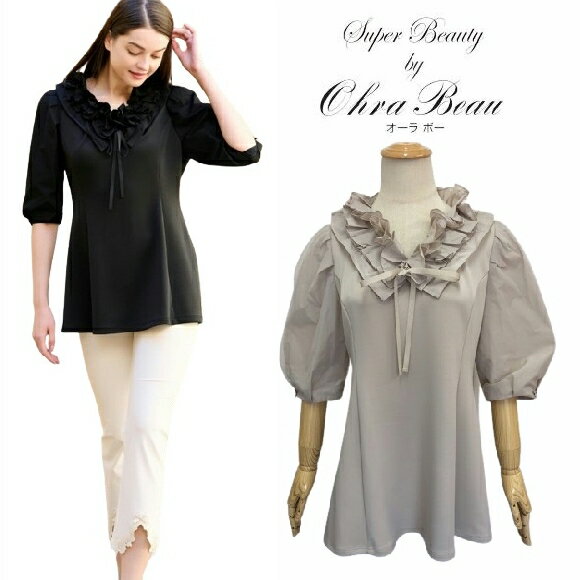 スーパービューティー チュニック フリル衿 二重袖 2412002 ベージュ 2024年春夏 大人可愛い オーラボー ミセス レディース キレイメ アパレル 女性 M L LL 30代 40代 50代 60代 若見え 洋服