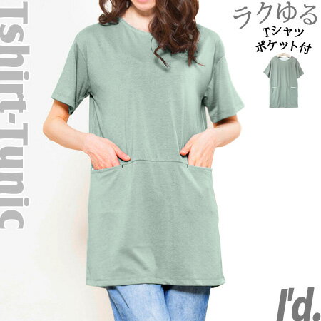 【メール便_送料無料】綿混 身幅ゆったり 半袖 ポケット付き ゆる Tシャツ チュニック カットソー 無地 ワイド幅 ロングTシャツ 夏 涼しい ビッグ 大きいサイズ Tシャツチュニック チュニックワンピ L LL レディース〔I'd.〕【3687】*
