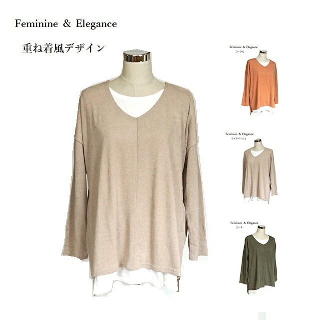 1枚で重ね着コーデ レイヤード風ニットソーチュニック (M・L)カーキ・コーラル・ライトベージュ 3色