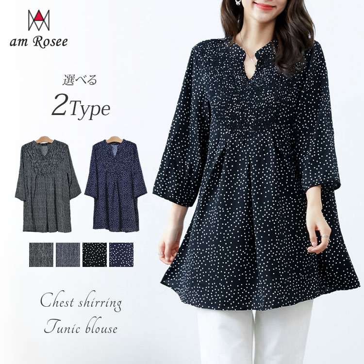 【メール便送料無料】胸シャーリングチュニックブラウス◆レディース チュニック ブラウス 7分袖 体型カバー ゆったり Vネック バンドカラー ロング丈 シャーリング ラインストーン ドット柄 ストライプ柄 30代 40代 50代◆