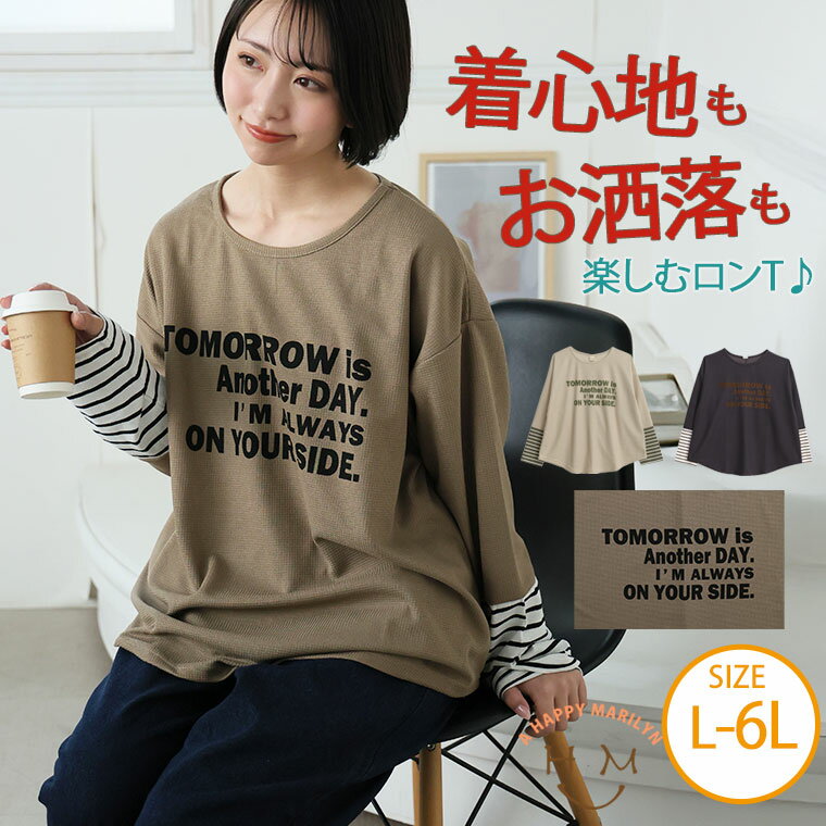 【期間限定クーポン配布】 大きいサイズ レディース チュニック | 【Pastel Leaf】 ロゴプリント チュニック _ トップス チュニック ボーダー LL 3L 4L 5L 6L 長袖 春 春物 春服 ぽっちゃり ゆったり プラスサイズ ロンT 裾ラウンド かわいい [44242]