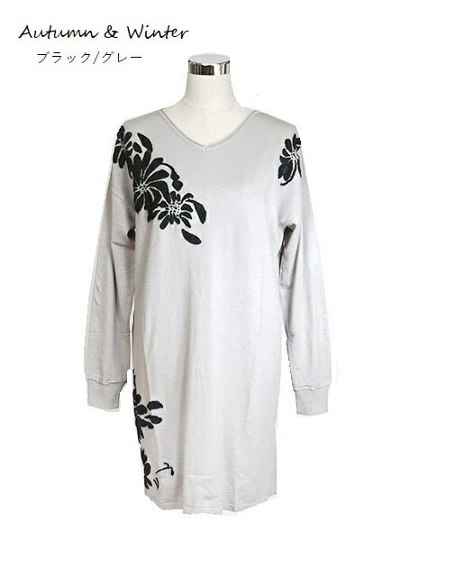チュニック 大人可愛い おしゃれ 春 秋冬 ミセス シニア ファッション 40代 50代 60代 70代 北欧風フラワー柄 裏起毛 キーネックチュニック