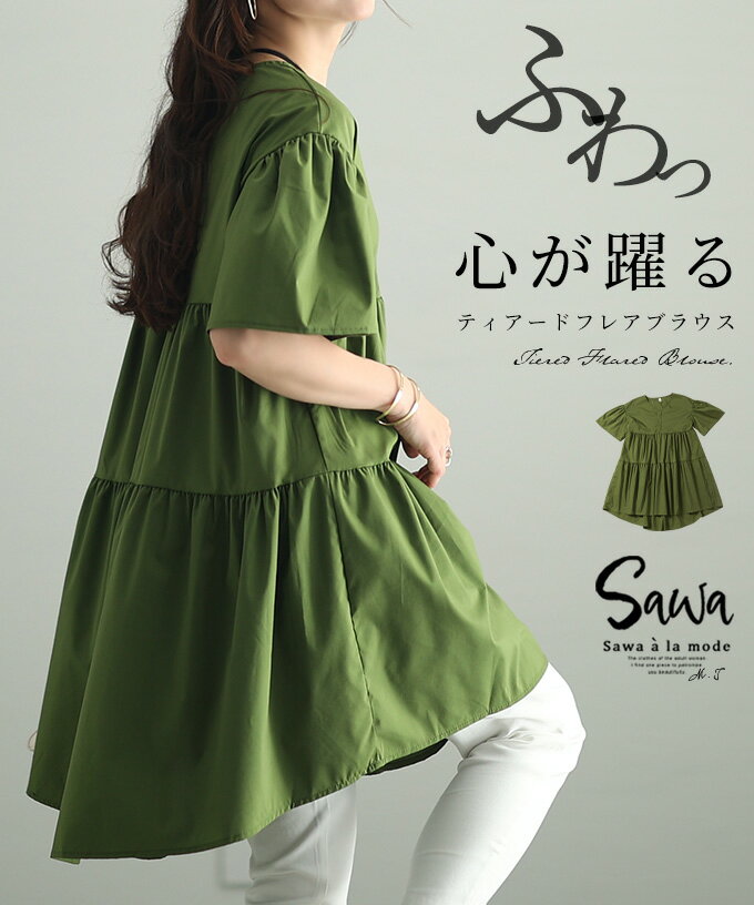 心躍るガーリッシュ纏うティアードチュニック レディース ファッション チュニック トップス ブラウス フレア ティアード 半袖 ボタン 比翼 グリーン 緑 30代 40代 50代 60代 サワアラモード sawaalamode otona 大人 kawaii 可愛い 洋服 かわいい服 【7月8日20時販売新作】