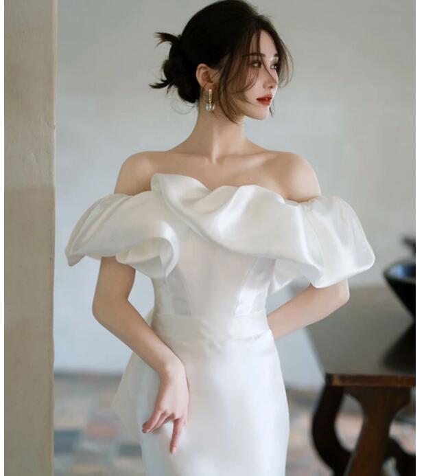 送料無料 ウェディングドレス オフショルダー セクシー 二次会ドレス オシャレ Aライン ドレス 白 サテン トレーンドレス 結婚式 二次会 ロングドレス ホワイト オフショル 無地 海外挙式 撮影 S M L XL XXL XXXL
