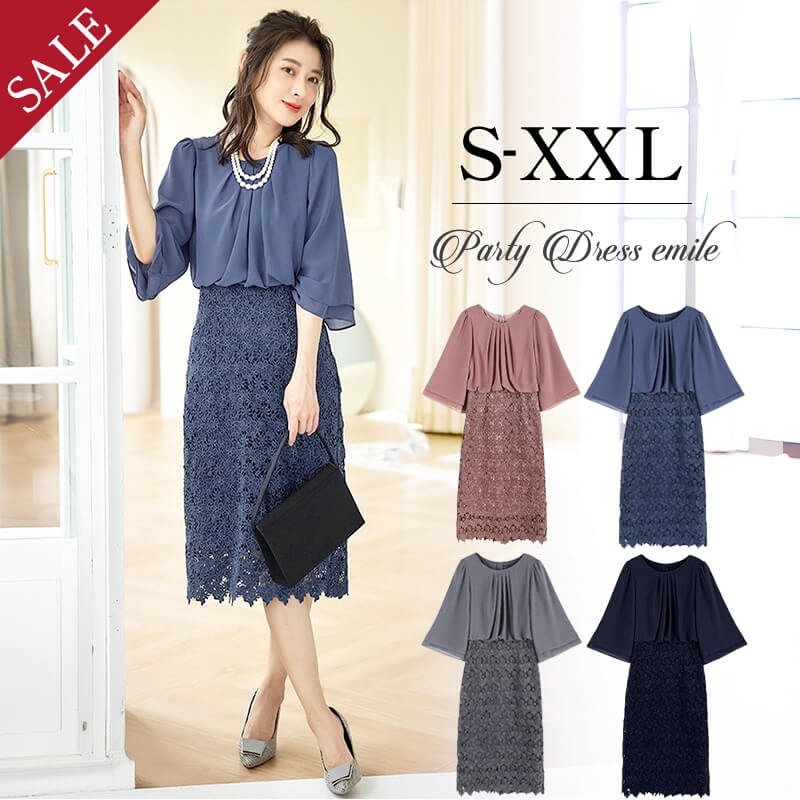 \選べるレビュー特典/ パーティードレス フォーマルワンピース 大きいサイズ 結婚式 ワンピース ドレス ミモレ丈 七分袖 袖あり 結婚式ドレス お呼ばれドレス 体型カバー 入学式 卒業式 卒園式 フォーマル デコルテ 袖 レース シフォン 母親 春 夏 秋 冬 emile0212