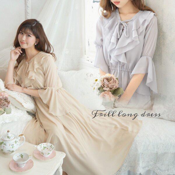 Raylily(レイリリー)シフォンフリルロングドレス 透け感 マキシ ゆったり シフォン 清楚 上品 リボン Aライン ゆったり