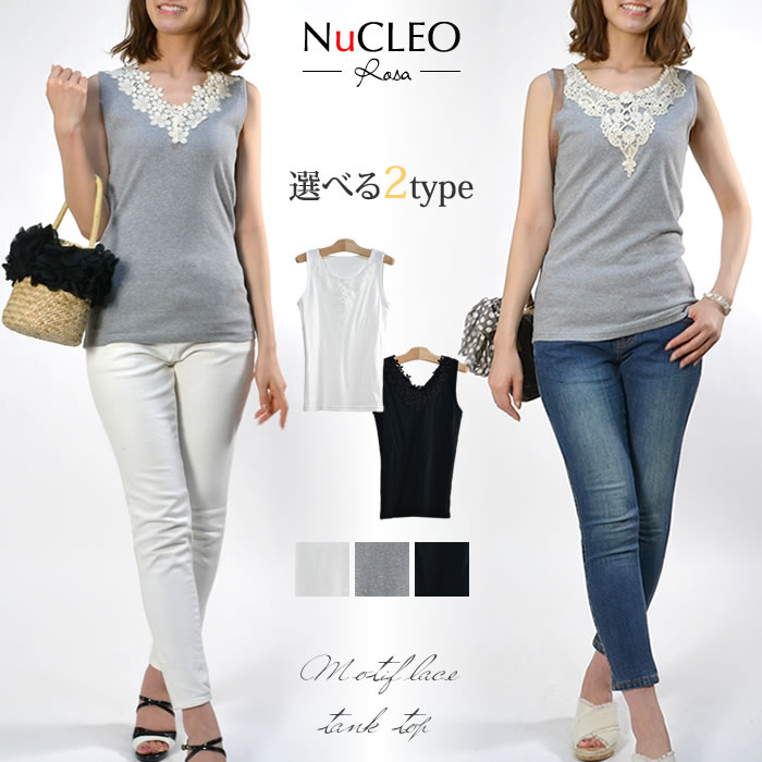 【メール便送料無料】モチーフレースコットンタンクトップ◆レディース インナー コットン 綿100% vネック uネック 春 夏 レイヤード 重ね着◆
