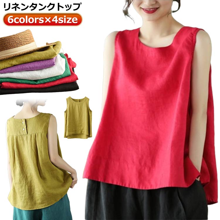 リネンタンク レディース タンクトップ リネン混 綿麻 麻生地 ノースリーブ コットンリネン ゆったり 薄手 清涼感 通気性 お洒落 シンプル カジュアル インナー トップス 春夏 夏新作 イエロー レッド グリーン パープル ブラック ホワイト