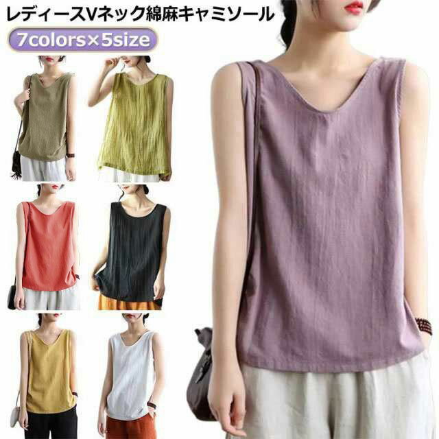 綿麻トップス キャミソール リネン Vネック 綿麻 タンクトップ タンク キャミ 涼しい 薄手 ナチュラル サラサラ ノースリーブ 肌着 下着 トップス 無地 シャツ おしゃれ 可愛い 大人 女性 夏服 部屋着 シンプル インナー 重ね着 送料無料