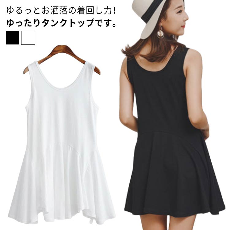 タンクトップ レディース ロング インナー アシンメトリー裾 レイヤード風 チュニック ノースリーブ 重ね着 インナー ノースリーブ フレア ワンピース 春 夏 秋 カジュアル おしゃれ 大きいサイズ ブラック ホワイト S M L XL