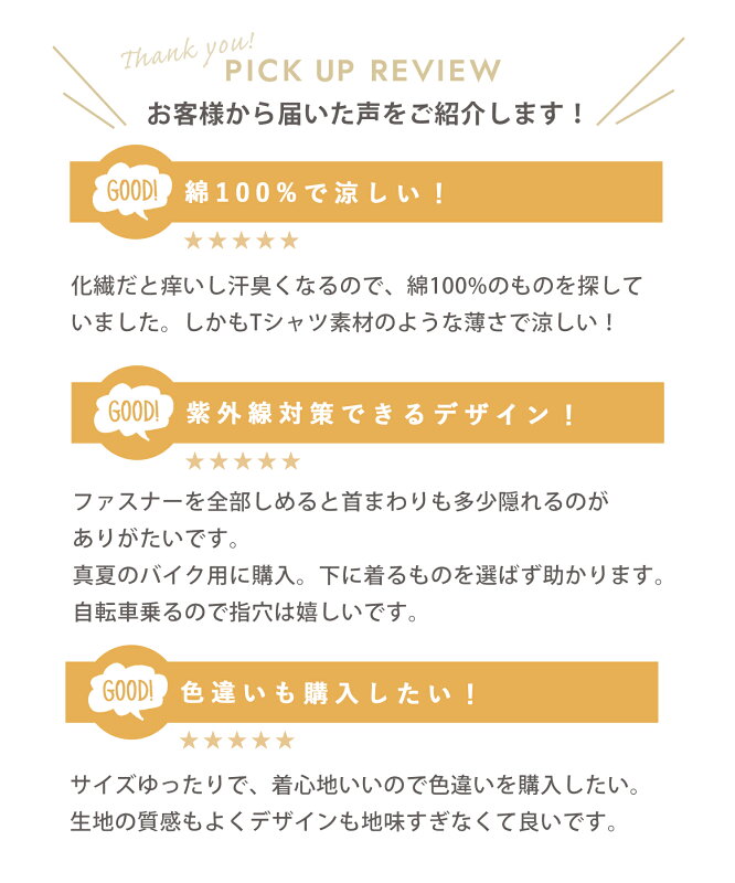 一つだけ言わせていただくと、春夏の車通勤の際の紫外線対策に着用しているので、袖口のロゴネームが右側に付いていたらなお良かったです。