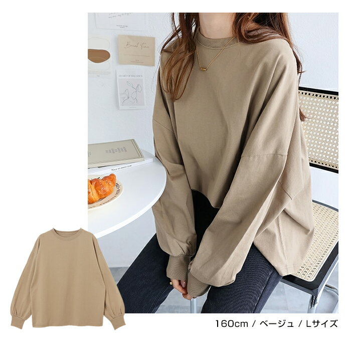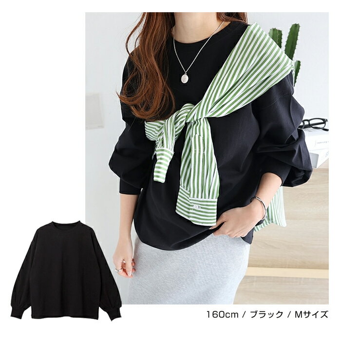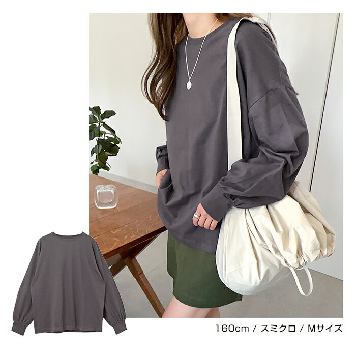 【メール便対応C】【一部予約】Tシャツ 長袖 長袖Tシャツ ロンT レディース コットン ボリューム袖 無地/ボーダー オーバーサイズ 体型カバー クルーネック ベーシック カジュアル コーマ天竺 M/Lサイズ 春 秋 冬