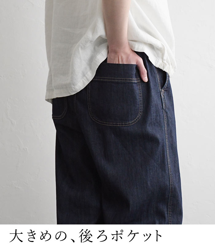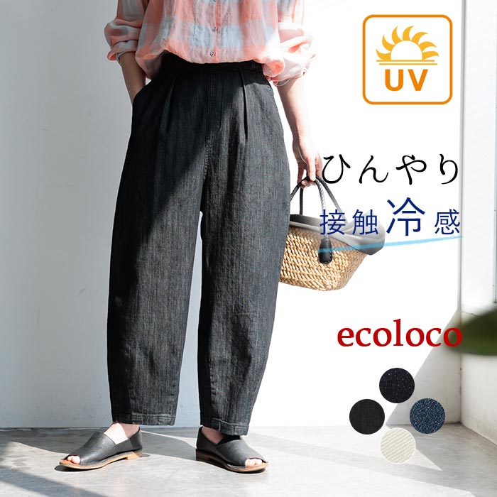 【6/4-11ポイント10倍】 M~3L オリジナル 接触冷感 ボールパンツ デニム UVケア ワイドパンツ/着後レビューでクーポン☆ カジュアル ひんやり ウエストゴム ゆったり ボトムス エコロコ レディース e+ Ms,Ls,LL,3L/ 30代 40代 50代 大きいサイズ 春 夏 24SS0424R,