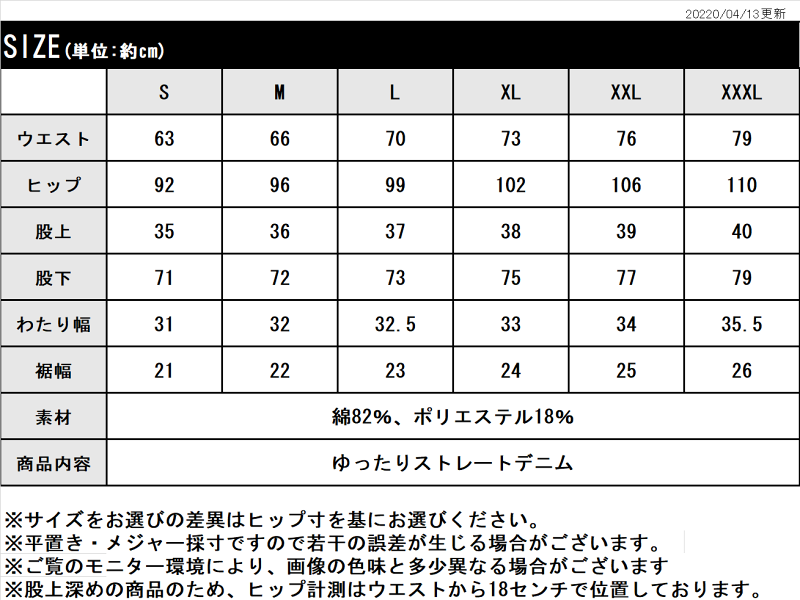 店舗様がLサイズを取寄→複数在庫の計測をした所サイズ表と実寸にかなり差異があったようでした(例:サイズ表→ヒップ108cm、実寸→ヒップ98cm)。
