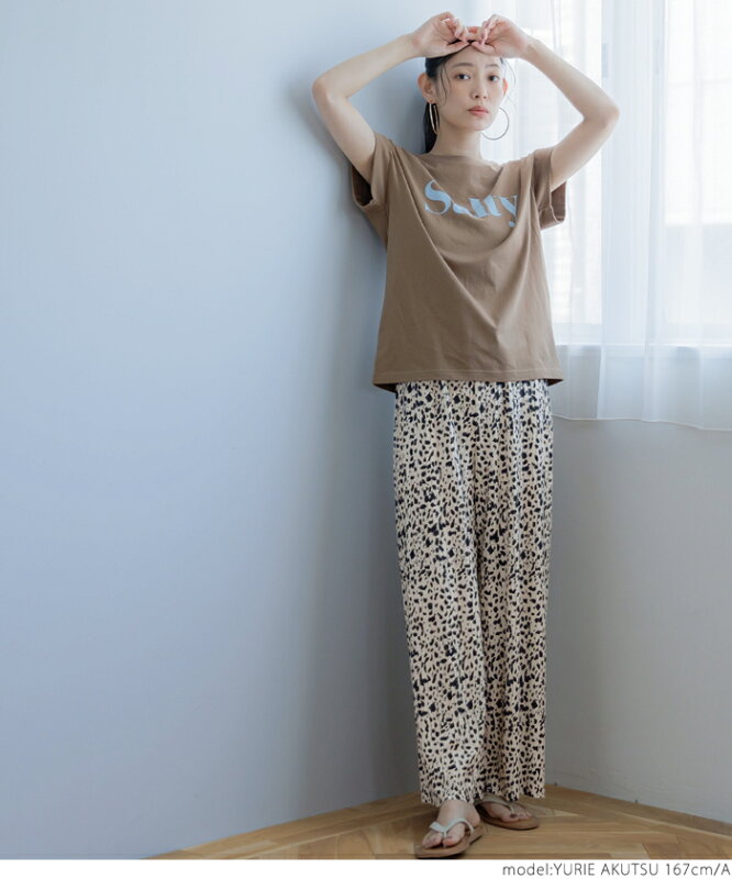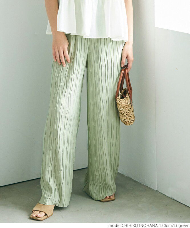 ウェーブプリーツパンツ レディース ワイドパンツ カットオフ ウェーブプリーツ ウエストゴム イージーパンツ 無地 ドット メール便可mrb 24ss coca