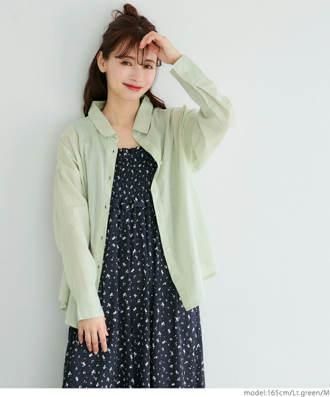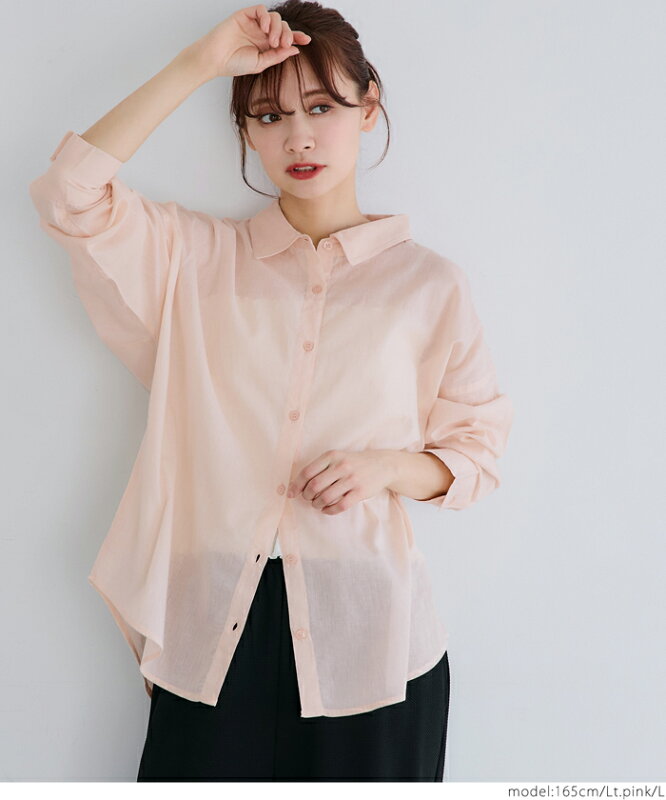 ガーゼシャツ レディース ブラウス ガーゼ 前後差 コットン 透け感 シースルー シアー素材 前開き 長袖 無地 薄手 メール便可 24ss coca コカ