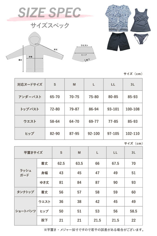 タンクトップがゆるめ、インナーショーツきつめ、ラッシュガードとショートパンツはぴったりのサイズ感でした。