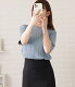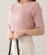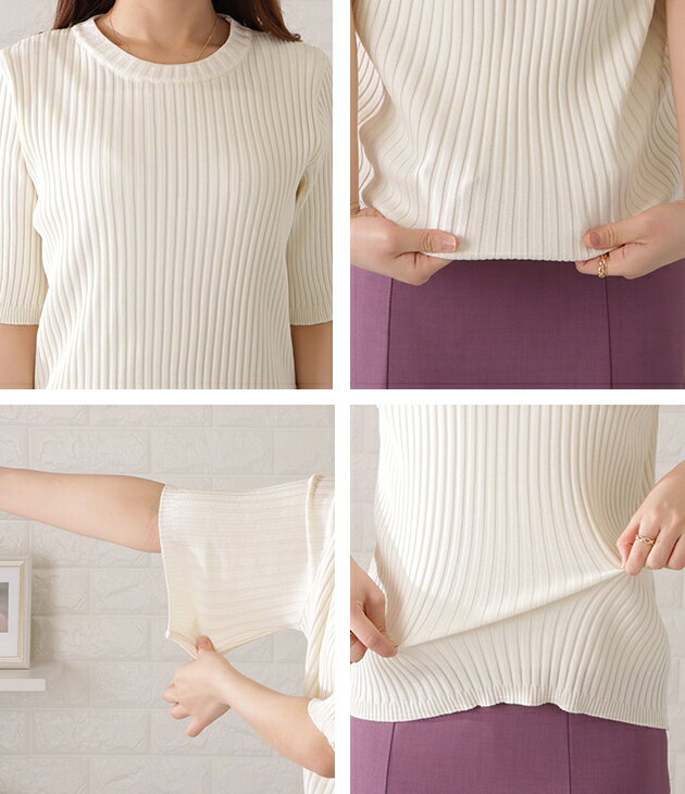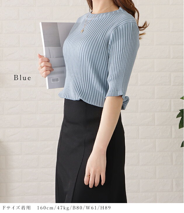 5分袖 サマーリブニット トップス レディース ホワイト ブラック ブルー ピンク 大人可愛い 五分袖 半袖 春 春夏 夏 サマーニット Uネック オフィス フェミニン きれいめ