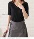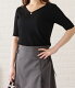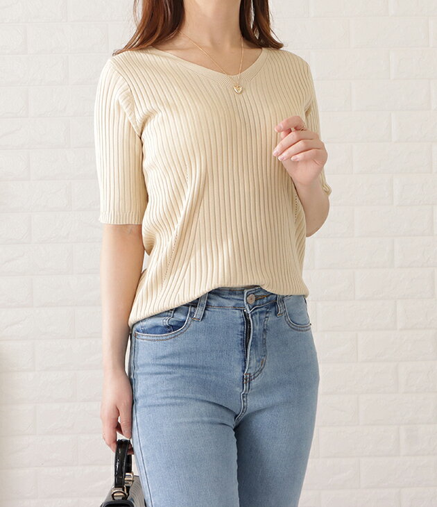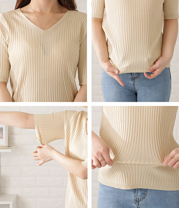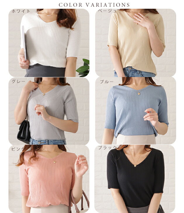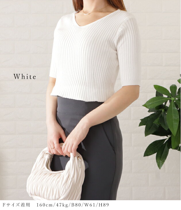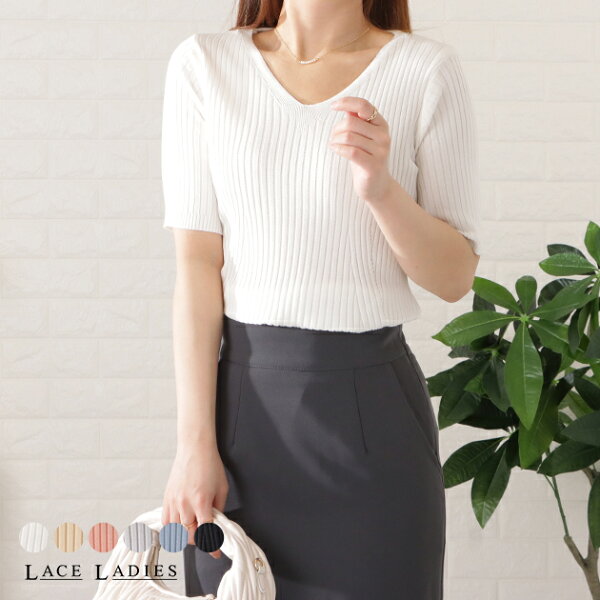 Vネック アイスシルク セーター 半袖 ホワイト ブラック グレー ベージュ ブルー ピンク リブニット サマーニット フェミニン きれいめ オフィス Vネック ストレッチ 春 春夏 夏 トップス レディース 五分袖
