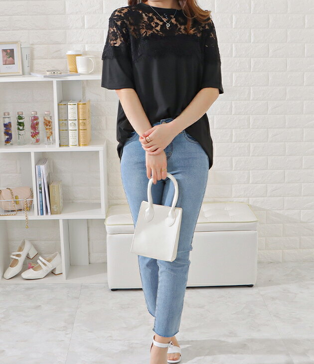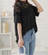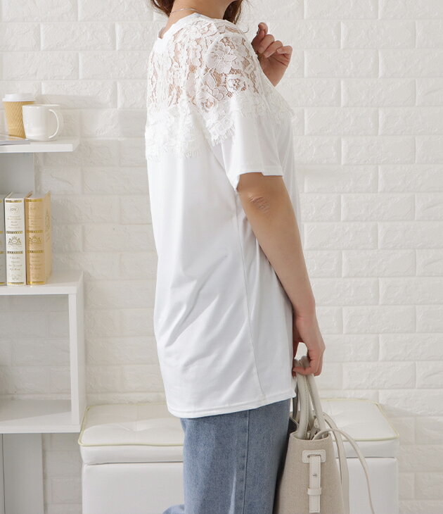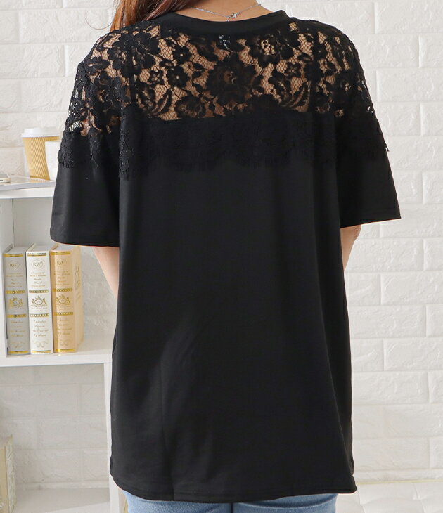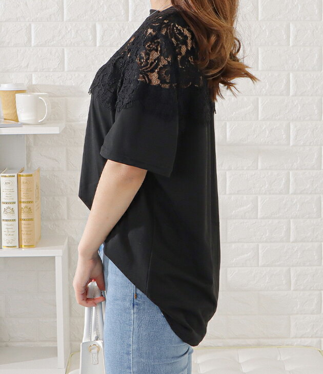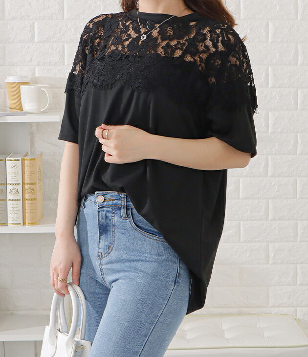 レース切替半袖Tシャツ レディース 女性 トップス 半袖 プルオーバー Tシャツ 丸首 春 夏 デコルテ 上品 エレガント レース フェミニン 華やか 肌見せ ヘルシー ドレッシー ジャケット インナー ブラック ホワイト デイリー