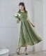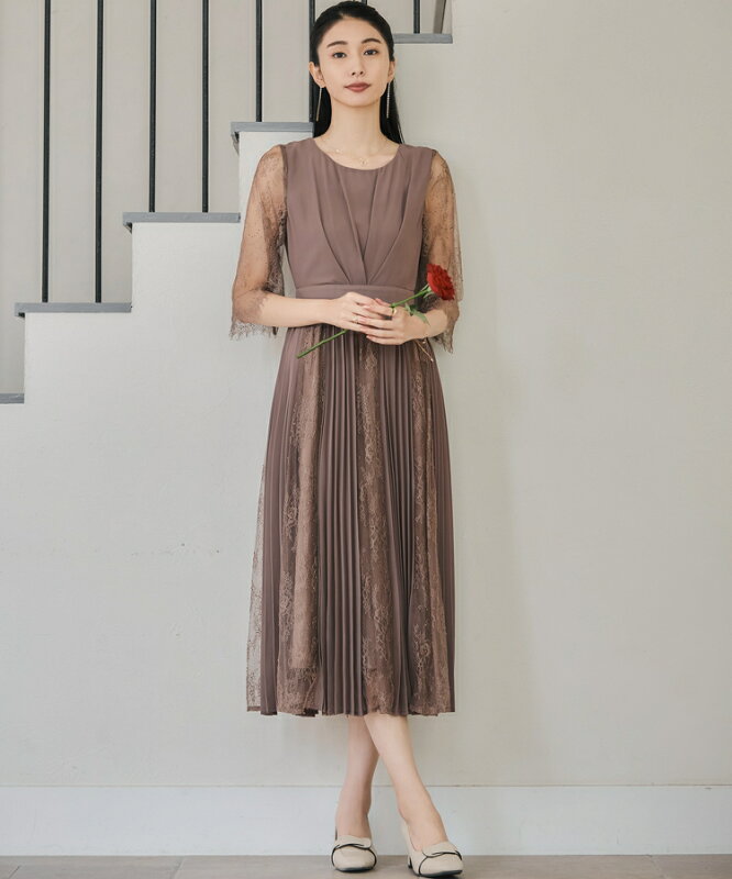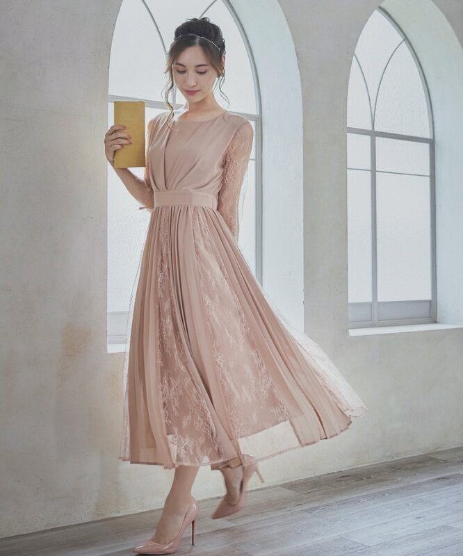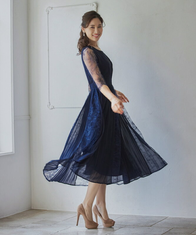 [半額SALE]パーティードレスドレス ドレスワンピース ロングワンピース ワンピース レディース レース シースルー袖 裏地付き ロング丈 ミモレ丈 袖あり ドッキング プリーツ 結婚式 二次会 パーティー エレガント 透け感 きれいめ dsj0014