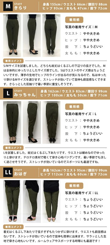 全体的にダボっとしていて丈もくるぶしにかかるぐらいでもうちょっと短いと良い、ふくらはぎのばたつきも気になりました。