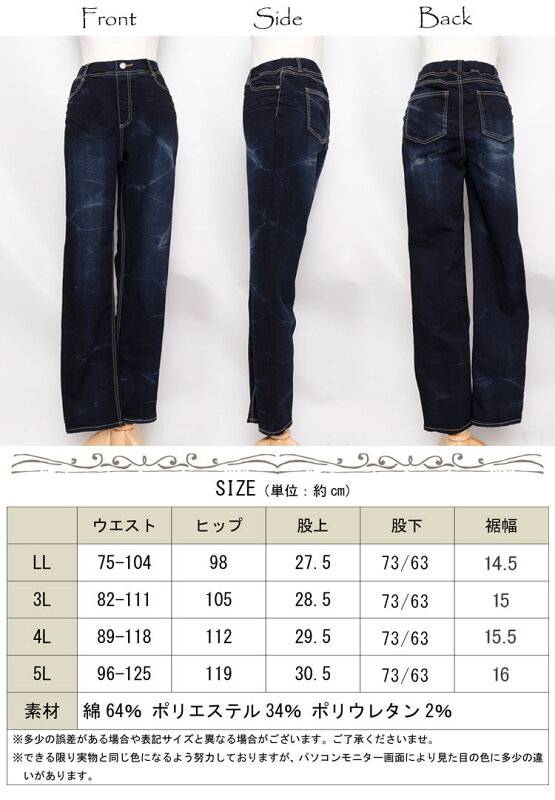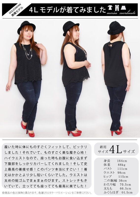 自分は3Lから4Lサイズとかなり太いので、正直、デニムというよりはスパッツとスキニーパンツの間、みたいなピッタリした感じになります(キツくはないですが)。