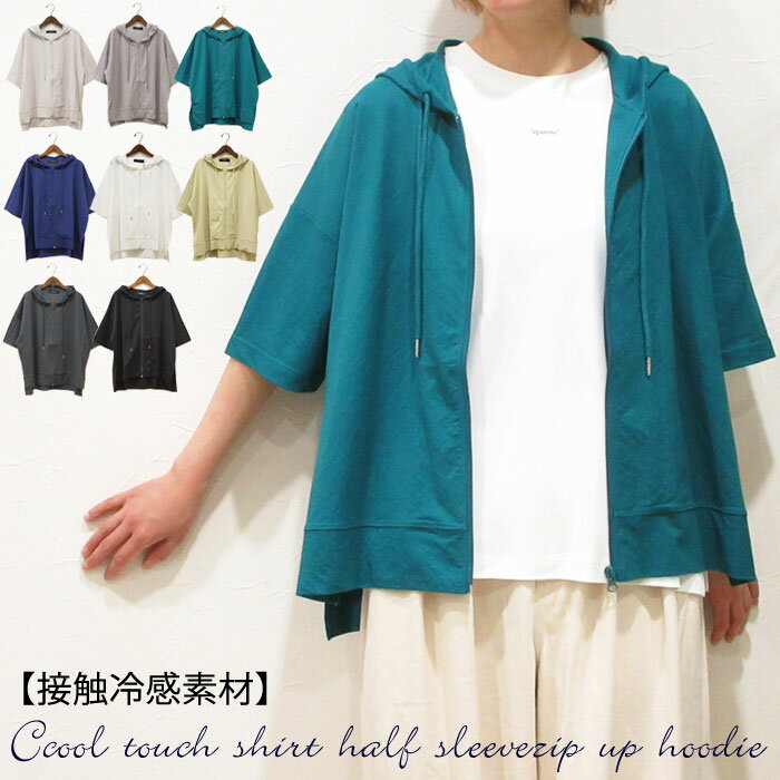 クーポン利用で最大【10%オフ】【新色入荷】レディース 接触冷感 涼しい さらさら パーカー フーディー トップス フード付き 半袖 5分袖 前後アシメ丈 ストレッチ素材 クールタッチ 伸縮 軽い ブラック ホワイト モカ ブルー イエロー チャコール ブルー 7123-5384 夏